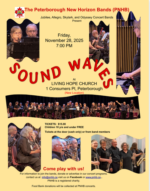 Come hear all 5 concert bands perform familiar and festive pieces. Tickets sold at the door or from a band member, $15 children 10 and under free. Cash only. Non refundable. Bring a canned good to donate to the Kawartha Food Bank.